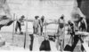 A black-and-white photo of the construction of the dam around the pool of El Morro. Seven men work with shovels, buckets, and wheelbarrows around a wooden frame.