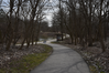 This view looks south from the Lock 39 Trailhead parking lot. A paved path leads to a kiosk with two exhibit panels and a bulletin board. The Ohio & Erie Canal and its Towpath Trail head north and south.