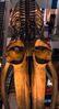 A large whale skeleton is displayed above an escalator in a museum. The skeleton is suspended from the ceiling.