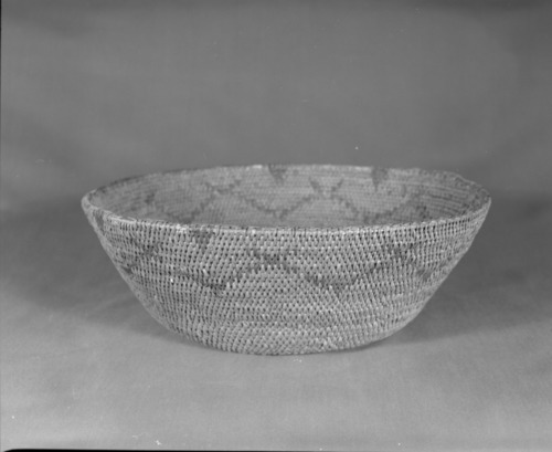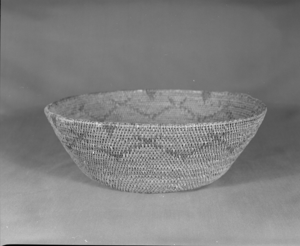 Mrs. Donald Segerstrom Collection. Object: Paiute basket. Dimensions: 13 x 8 1/2". Materials: sedgeroot, bracken fern, redbud, willow. Technology: interlocking stitch, overstitched rim worked opposite direction, fag ends trimmed on work face, moving ends t