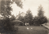 Frank Avery (?) watering lawn at Fort Spokane with two children. The boy is seen elsewhere with Mrs. Avery. Taken c. 1905.