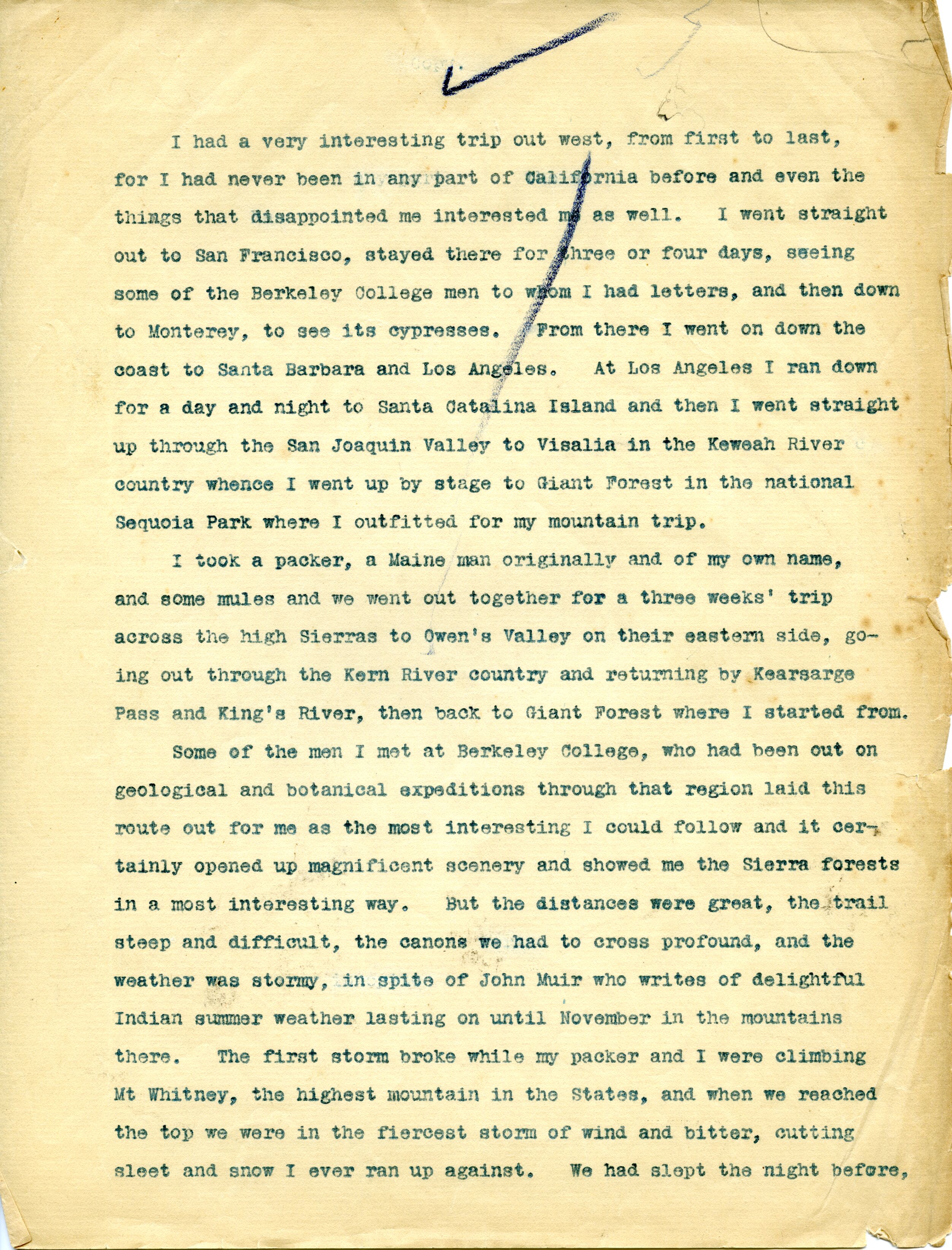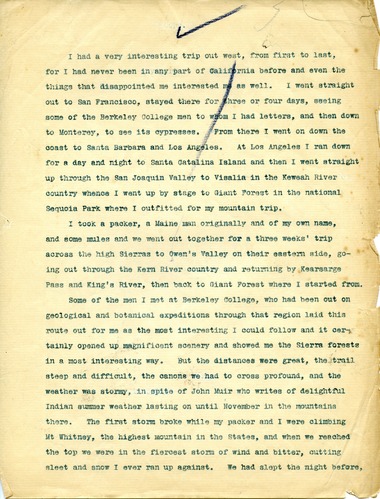 Dorr's trip to California where he visited Berkeley College acquaintances and traveled extensively around the natural parks including Giant Forest.