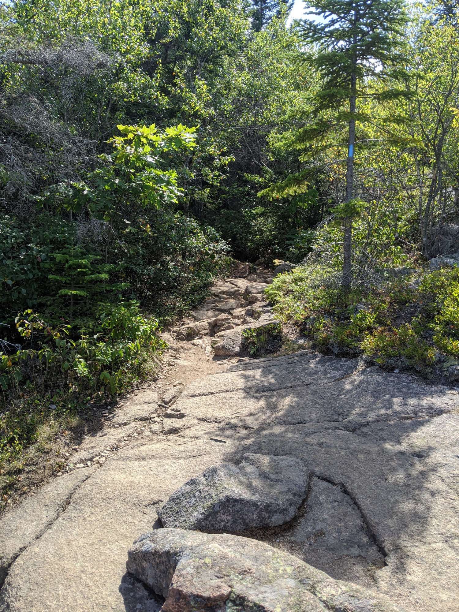 Follow blue blazes as the trail goes from a forested path to more exposed areas