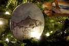 Student-made ornament of an illustrated Brook Trout lit by Christmas lights.