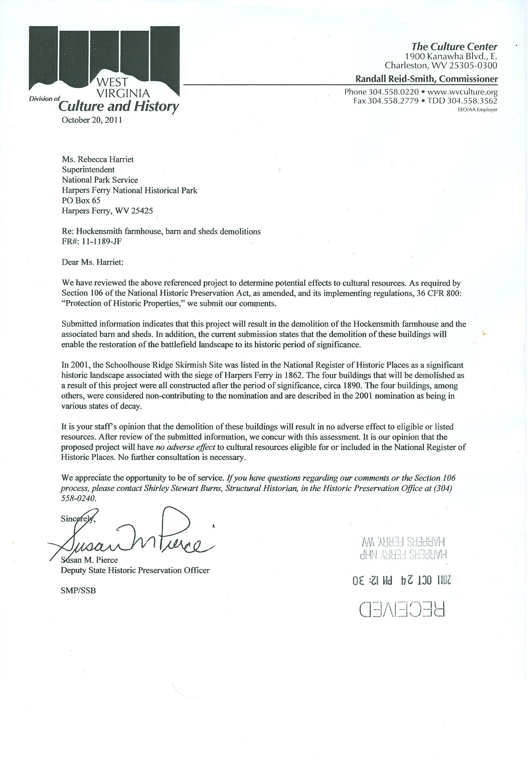 Section 106 Compliance Letter from WV SHPO to Approv Demo HFNHP Oct 2011