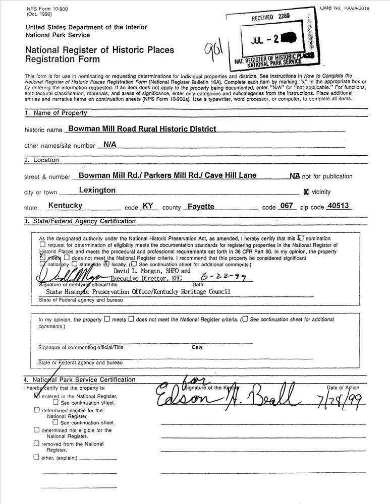 Lexington ; Bowman Mill Rd., Parkers Mill Rd., and Cave Hill Ln.
