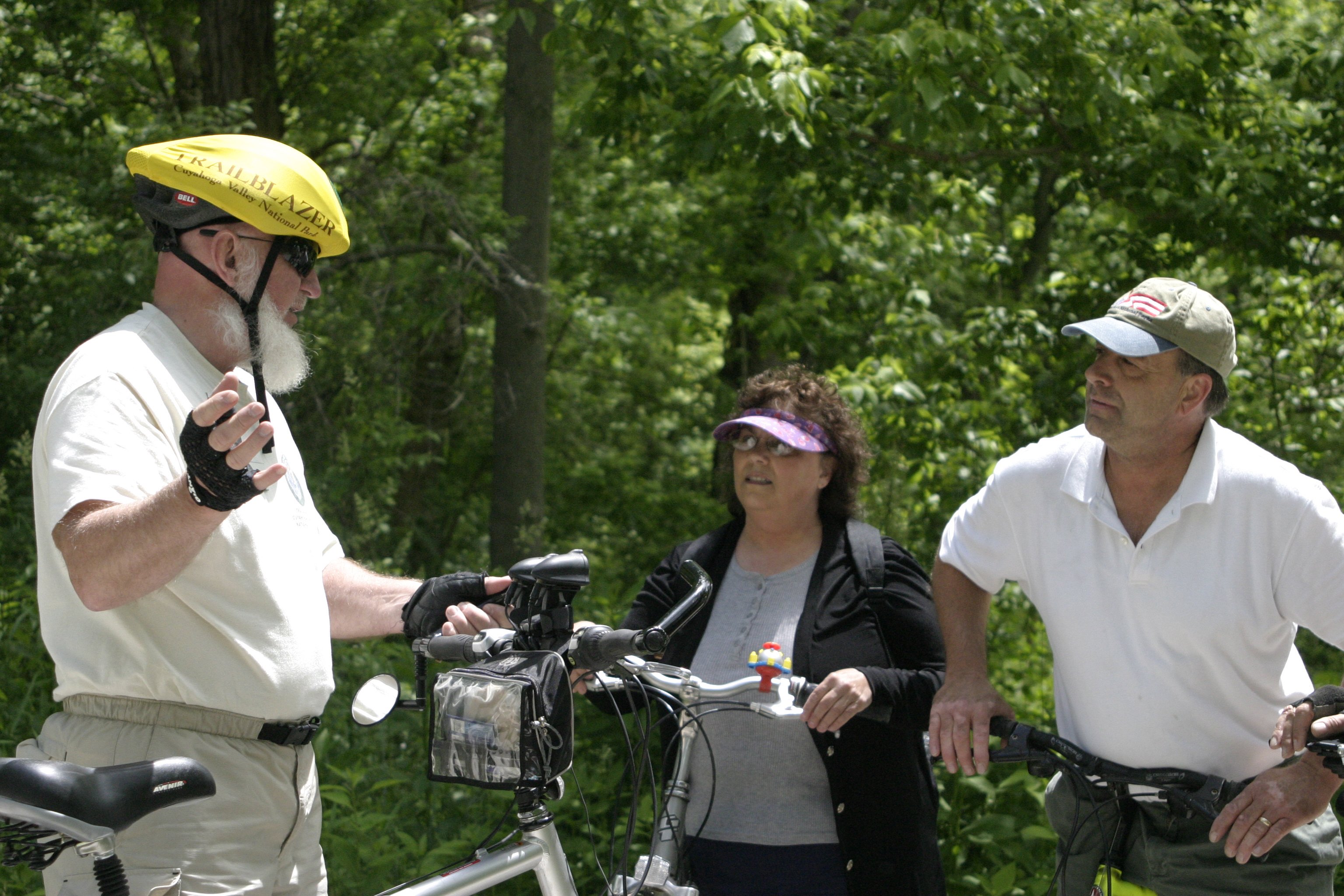 At Cuyahoga Valley National Park volunteers perform a wide variety of duties during every season of the year. Currently over 2,021 volunteers donate over 70,195 hours to the park. || Trailblazer volunteers assist the park by patrolling the Towpath Trail in pairs on bicycle. These volunteers have stopped to talk with visitors.