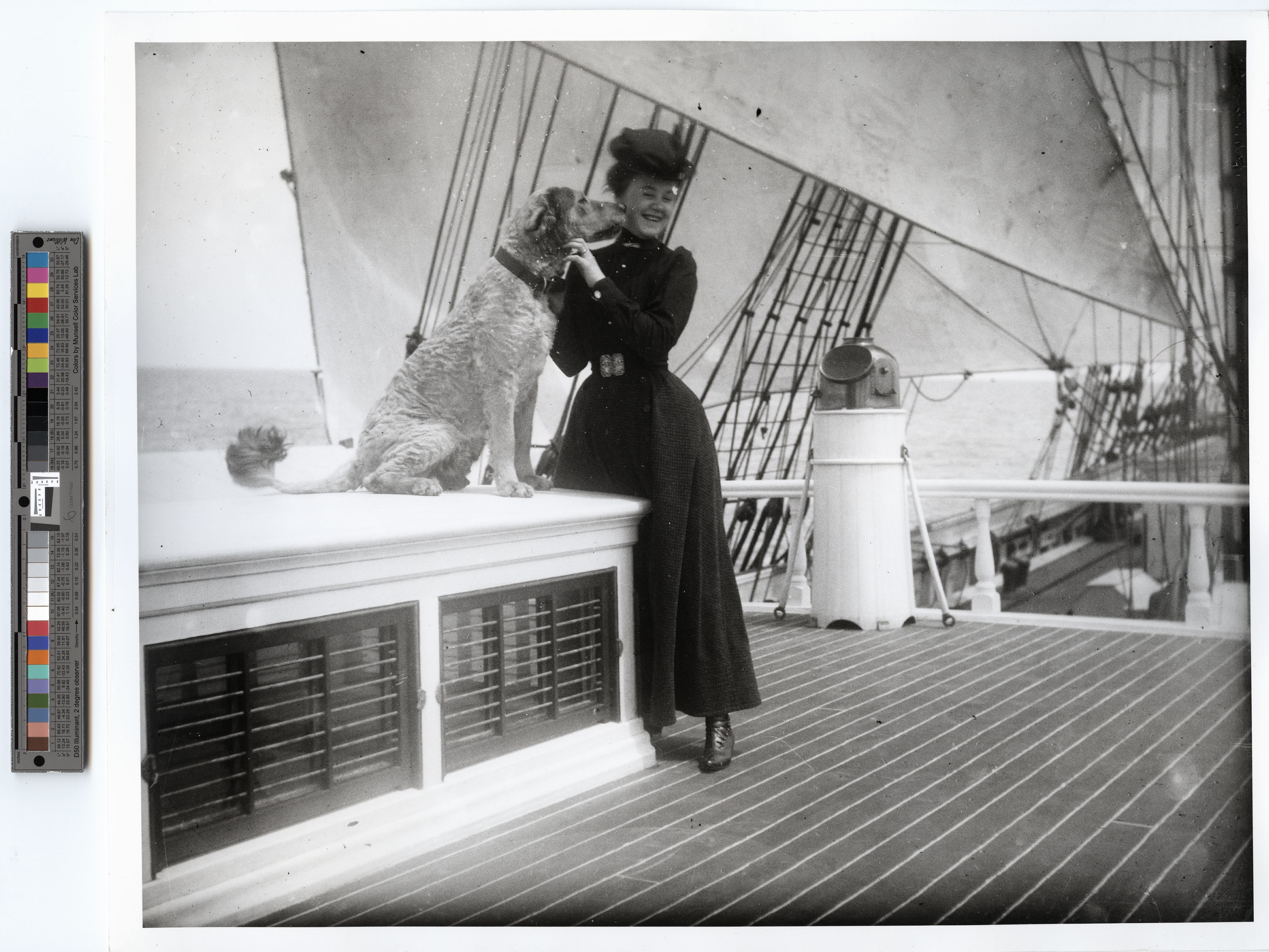 St. James (bark, 3m) view on the poop deck of Mrs. Agnes Tapley and a dog, undated