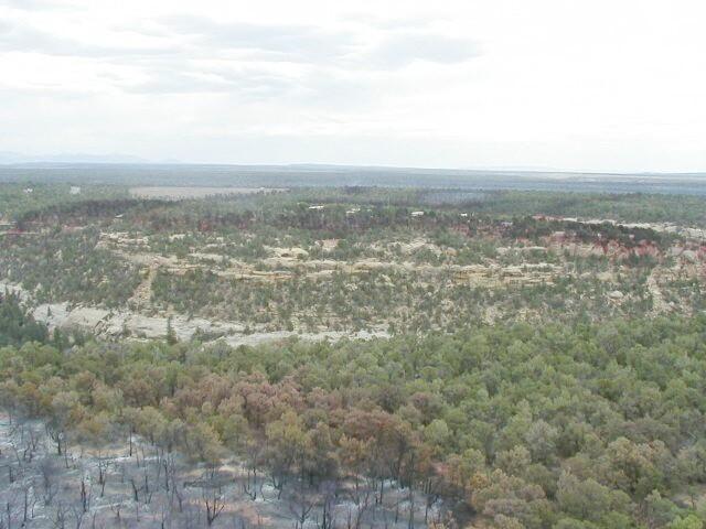 Aerial views of Chapin Mesa area in and around buildings depicting burn areas in the aftermath of the Long Mesa Fire at Mesa Verde National Park, August 2002