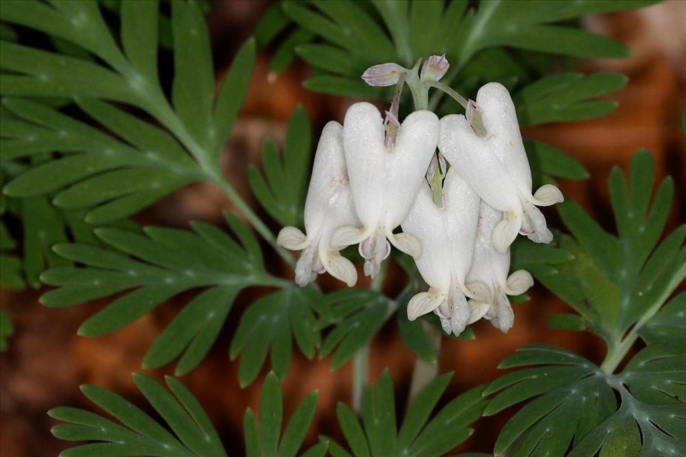 Squirrel corn (Dicentra canadensis) may be confused with Dutchman's breeches (Dicentra cucullaria) where ranges overlap. Tell them apart by the flower shape: squirrel corn has flower-shaped blooms while the Dutchman's breeches, perhaps not surprisingly, has flowers that are more similar to the shape of elongated leggings. Native to deciduous woodlands in eastern North America, this plant is spring ephemeral which means that it flowers in spring and becomes dormant in summer.