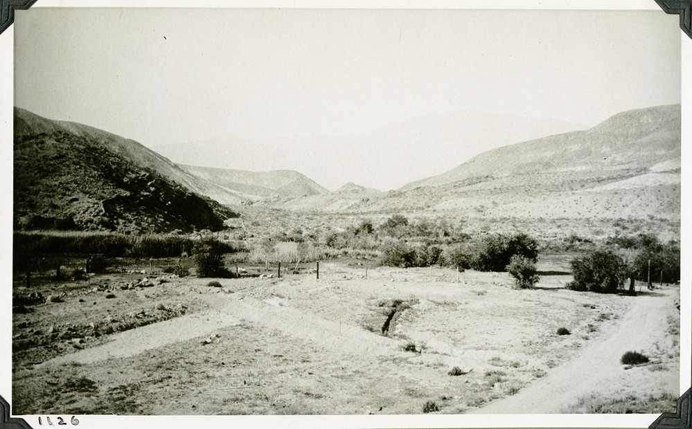 Death Valley Ranch looking south down Grapevine Canyon. Circa 1922. Possibly immediately before 1st phase of construction of original Johnson buildings. Located just below what would be Scotty’s Castle Main House. Field has various features such as the road, two ditches, fences, and trees. Number in black ink lower right corner refers to historic photograph numbering system: 1126. Listed in earlier catalog record Other Numbers Field: 16. Black and white, 5 x 8 inch, horizontal format. Corner mounted on photograph album page.