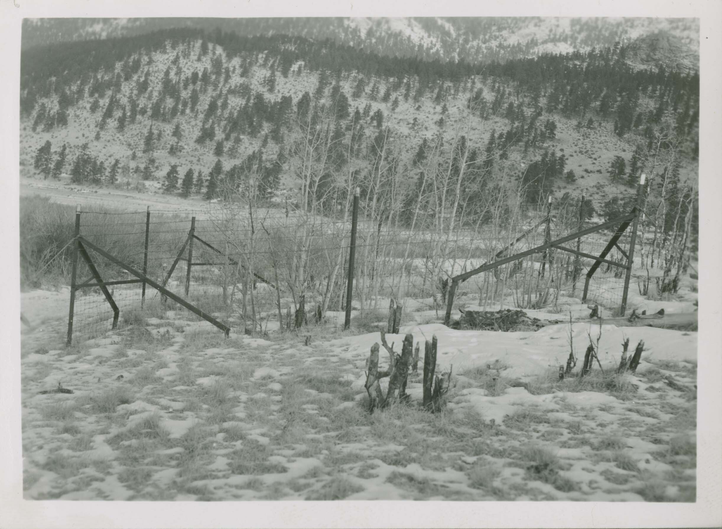 Range enclosure protecting aspen reproduction from destruction by elk and deer. Locality: East end of Horseshoe Park, Rocky Mountain National Park. Negative #: 11501