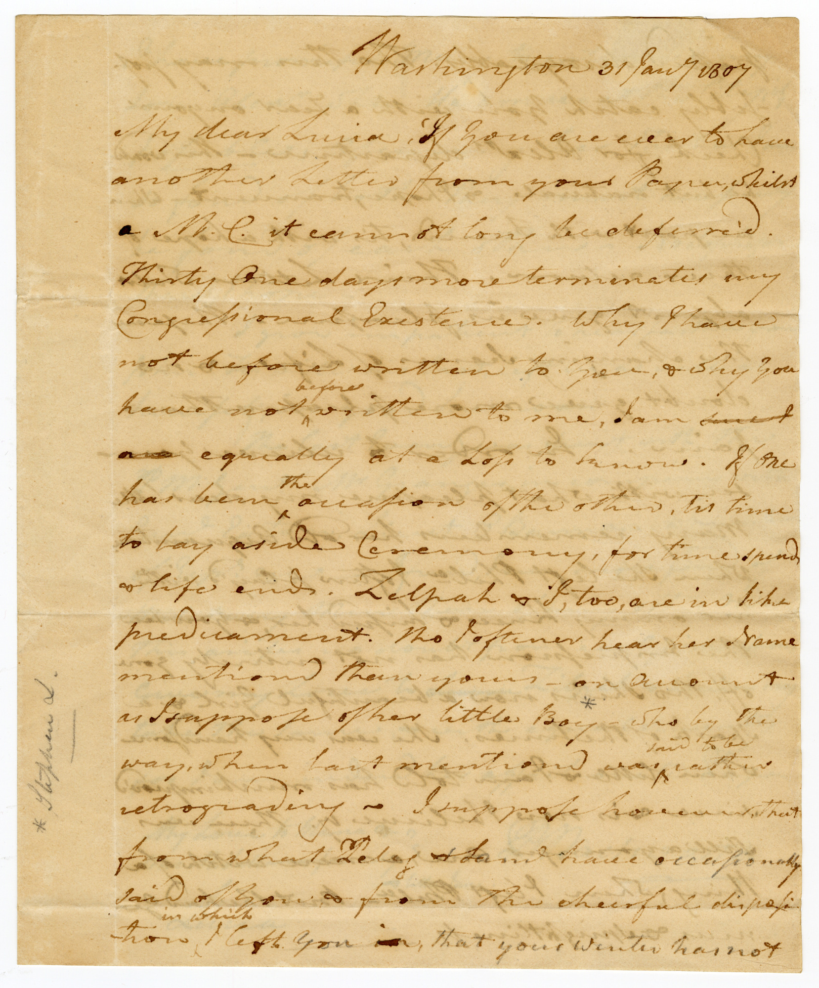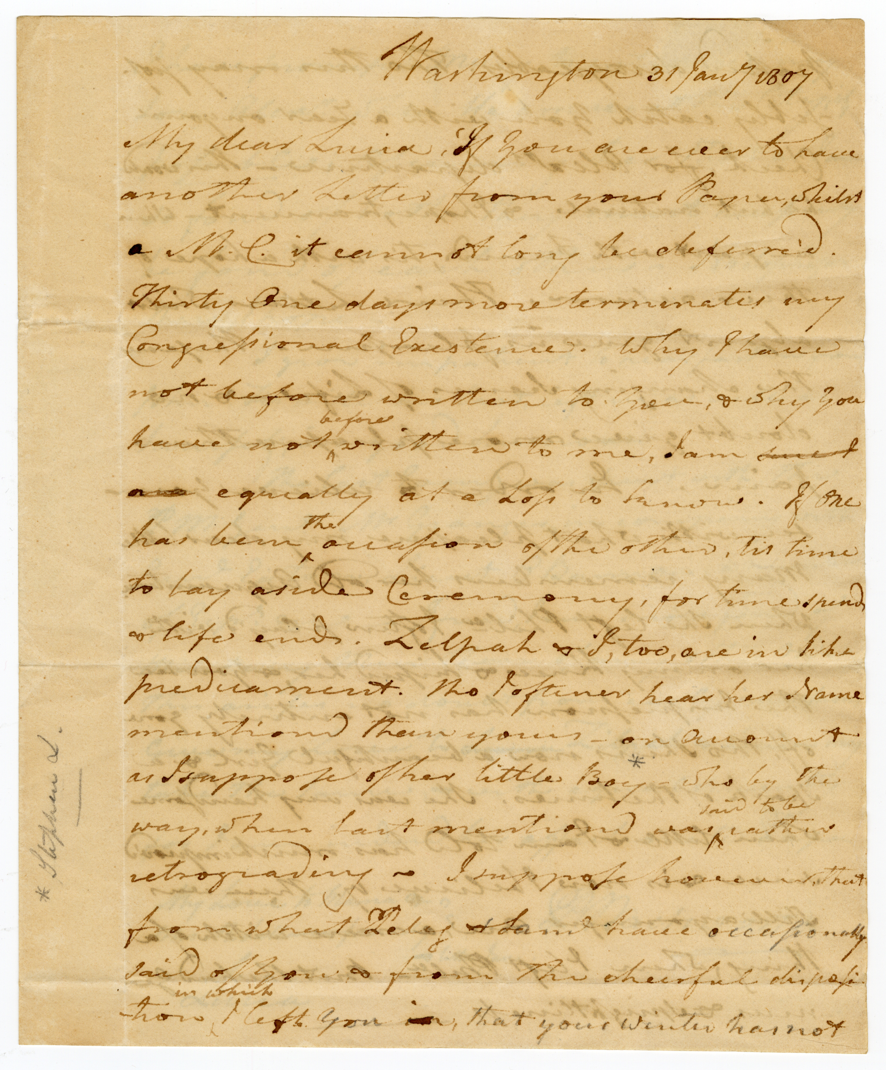 Washington 31Jany1807 My dear Lucia: If You are ever to have another Letter from your Papa, whilst a M.C. it cannot long be deferred. Thirty One days more terminates my Congressional Existence. Why I have not before written to You, & why You have not ^before written to me, I am sure I are equally at a loss to know. If One has been ^the occasion of the other, tis time to lay aside Ceremony, for time spends & life ends. Zilpah & I, too, are in like predicament. Tho I oftener hear her Name mentioned than yours – on account as I suppose of her little Boy* - who, by the way, when last mention’d was ^said to be rather retrograding – I suppose however, that from what Peleg & Sam have occasionally said of You, & from the cheerful disposi-tion ^in which I left you in, that your winter has not [Sidebar Note:] *Stephen L. ( p. 2) passed disagreably[sic]. Tho this may pos-sibly catch you with a Tear on your Cheek, for Alexrs departure – This would be but natural - & I hope, transient – When we part with Friends, tis with a hope of their return. Their Letters whilst absent give us pleasure. These are the changing Scenes of Life - & no doubt give more pleasure than pain. In order to relieve you – see with what pleasure my dear little Mary remembers her old acquaintance? When she left Phila I often play’d with her on my knee & kissed her, & you see the Impression has not entirely gone off, tho she is now a beautiful girl & a spark of the times. She was very handsome when little & I am told has much improv’d since & is now I believe 17. There was still a younger One, a mere witch of a thing, when I left Phila – But she had ge-nius & sprightliness - (p. 3) I have promised Mary to introduce ^to her my son Alexr. When he arrives at the City, if possible; Assuring her, that as I am so fond of both – they must necessarily be fond of each other. No Sophism there, I hope – I grow impatient to hear farther from John. Tis will his last, left us, as well as himself, in good humour. The last Eveng was spent with the PM Genl Mr Granger, in company with Genl Eaton, Lieut OBannon, a number of Esqr. &c – I find, I am more fond of Military Men than any other order. This arises no doubt from early impressions. Give my Love to Lucia Zilpah & Lucia may take the same, & with equal sincerity for I am indeed her affectionate Papa.