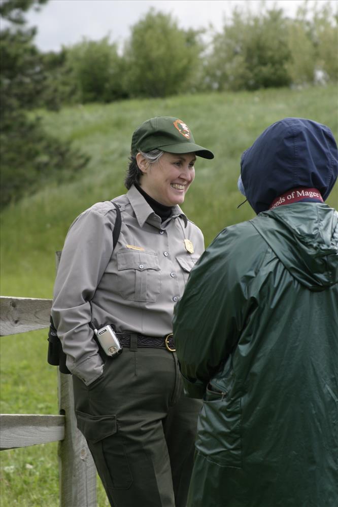 Cuyahoga Valley National Park is designated an Important Bird Area by the Audubon Society of Ohio, in part because of the restored grasslands at the site of the former Richfield Coliseum. A property once known for its sports/concert arena is now managed by the National Park Service as a grassland for rare birds. Cuyahoga Valley National Park offers year-round programs on bird watching. || Visitors talk with Lisa Petit, Chief of Resource Management; former Richfield mayor Ralph Waszak, Sr.; and another volunteer at an interpretive program called After the Coliseum in 2006. The program was an opportunity for local residents to learn how the park intends to manage this newly restored property. .