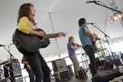 The band plays onstage under an outdoor tent, with their instruments which are: guitars, fiddle, and accordion.