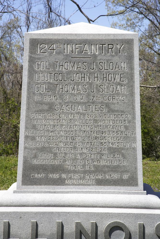 5' x 4'2" x 6'6", gray granite monument has double step base supporting an obelisk. ILLINOIS is in raised polished letters on 2nd step; face of obelisk is polished and inscribed with unit designation, commanders, campaign record.