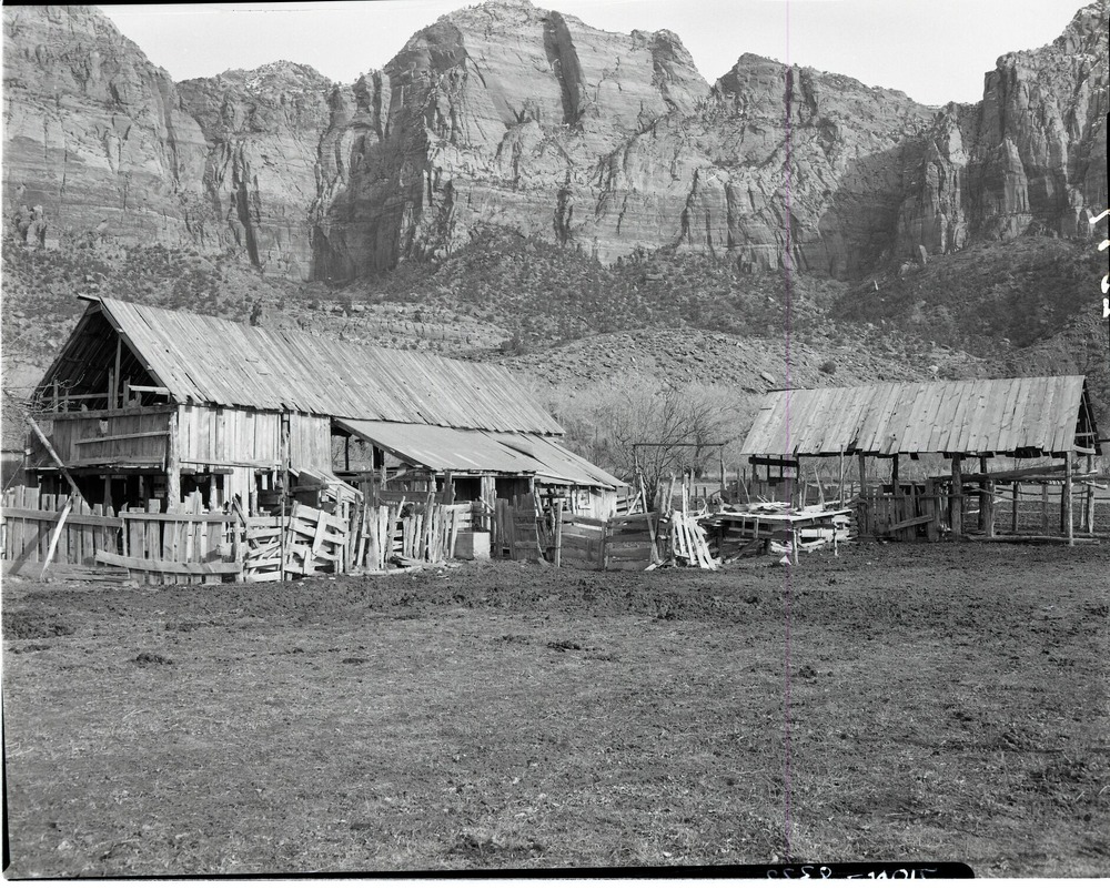 Albert E. Jones property, east of Virgin River, south of park boundary with house and outbuildings. ; ZION Museum and Archives Image 103_01_004 ; ZION 8298