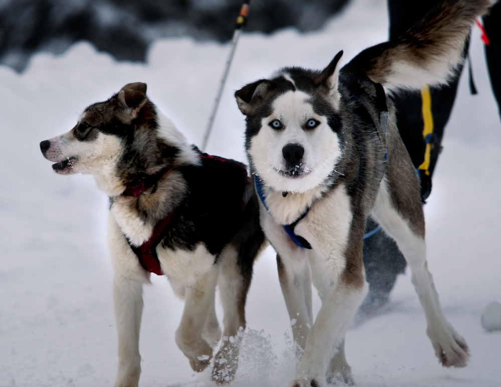 a young sled dog with an older one pulling a skier