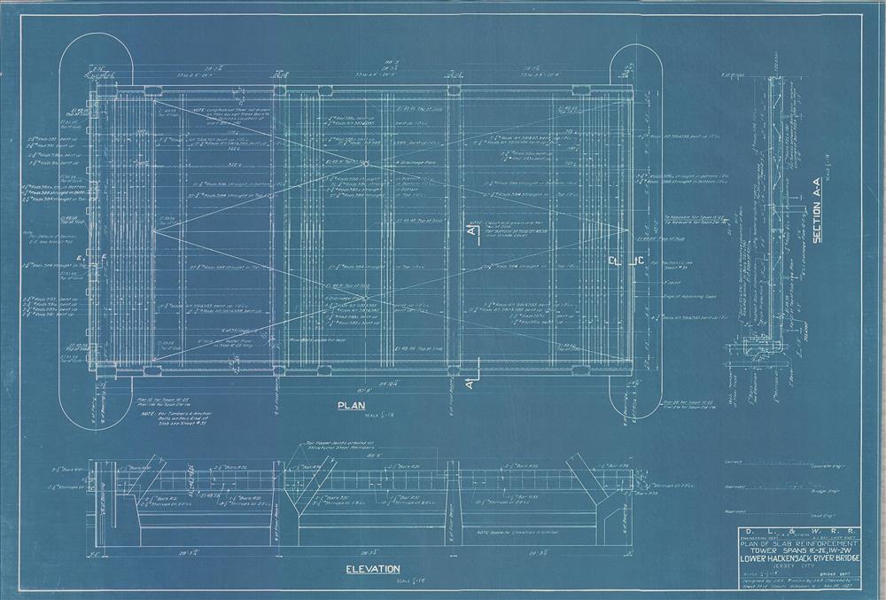 034 Lower Hackensack River Bridge--Plan of slab reinforcement--Tower spans 1E--2E, 1W--2W--Jersey City, NJ [1927.11.28] Sheet no. 34
