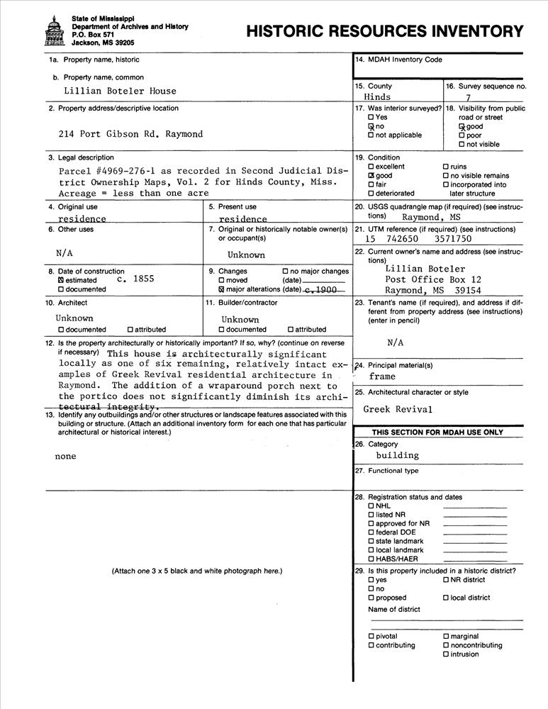 Raymond ; 214 Port Gibson Rd.