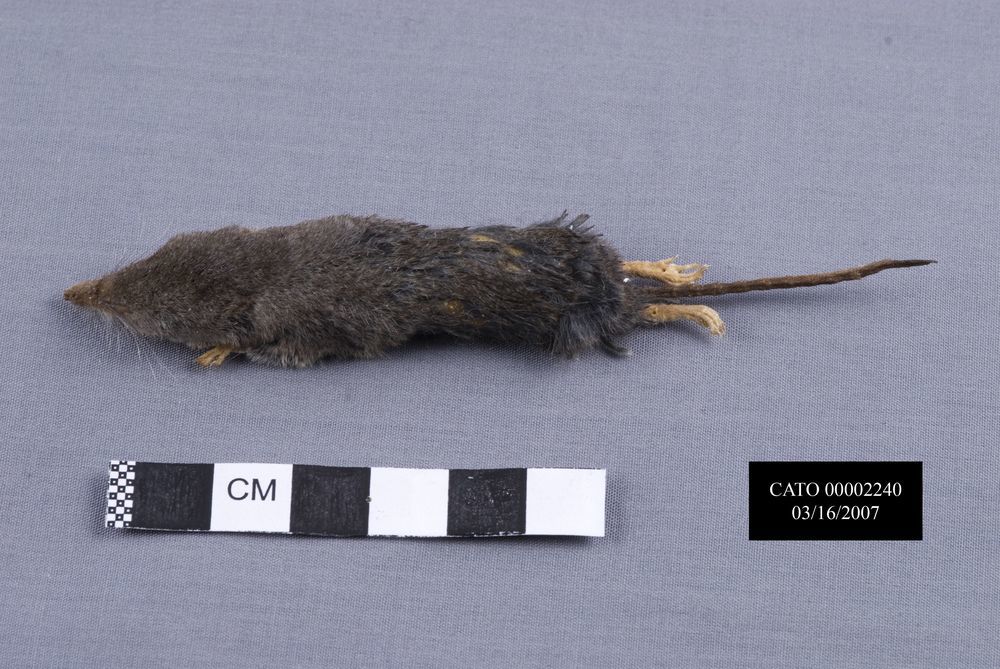 Sorex femeus,Smoky shrew skin 4 1/2 " long, 5/8" wide. Patches of missing skin. Skull in seperate vial.<br>Location ID CATO_H4<br>Field Number CJ05<br>Specimen ID 3381<br>Total length 104 mm<br>Tail length 39 mm<br>Foot 11 mm<br>Ear 2 mm<br>Weight 5.0 grams<br>Sex - Unknown<br>Age - Adult