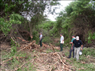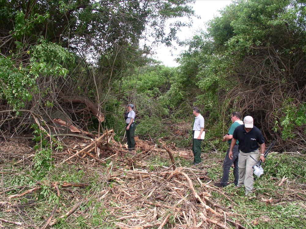 Men inspecting large pepper bush after Gyro Trac