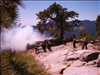 Prescribed fires are ignited by management to achieve resource objectives, which are usually a combination of ecosystem restoration and hazard fuel reduction. The Buena Vista prescribed burn was ignited on June 24-25, 2004. Fuels consisted primarily of short-needle mixed coniferous overstory and low-growing brush. The primary goals of the burn were to reduce hazardous fuels and to form an anchor point for future restoration projects in the Redwood Canyon area of the park. Firing was done by hand using a spot ignition pattern, and a total of 133 acres burned. These images show crew working and smoke and burning conditions of the fire.