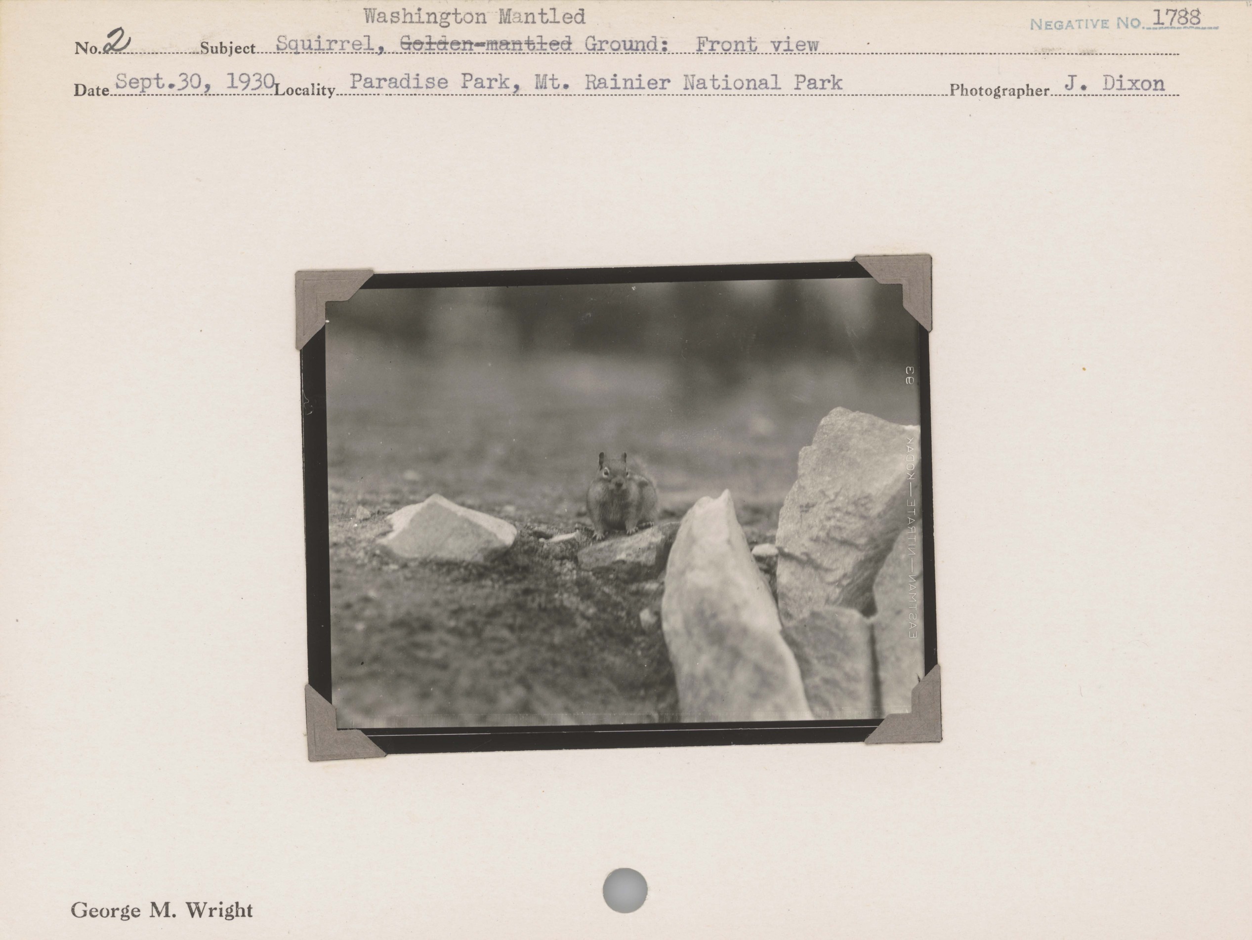 Squirrel, Washington Mantled Ground--Front view. Locality: Paradise Park, Mount Rainier National Park. Negative #: 1788