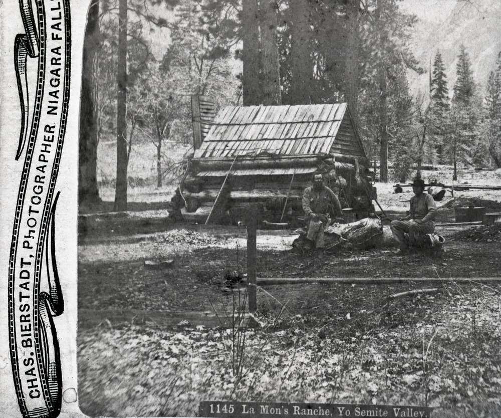 Copy Neg: Michael Dixon, July 24, 1985. Detail of L. Smaus stereo card (RL-16,441). Caption: "The First House int he Yosemite Valley, Cal." Lamon cabin.