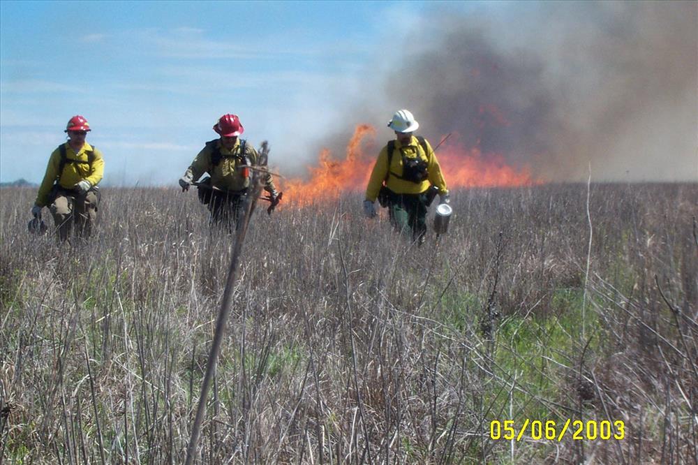 Depicts a prescribed grasslands burn at Fort Larned National Historic Site, May 2003.