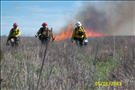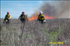Three members of fire crew walk through the prairie with fire in the background