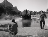 Men operating sealcoating machine while sealcoating parking area in Zion. ; ZION Museum and Archives Image 002.12.08-4of9 ; ZION 15933