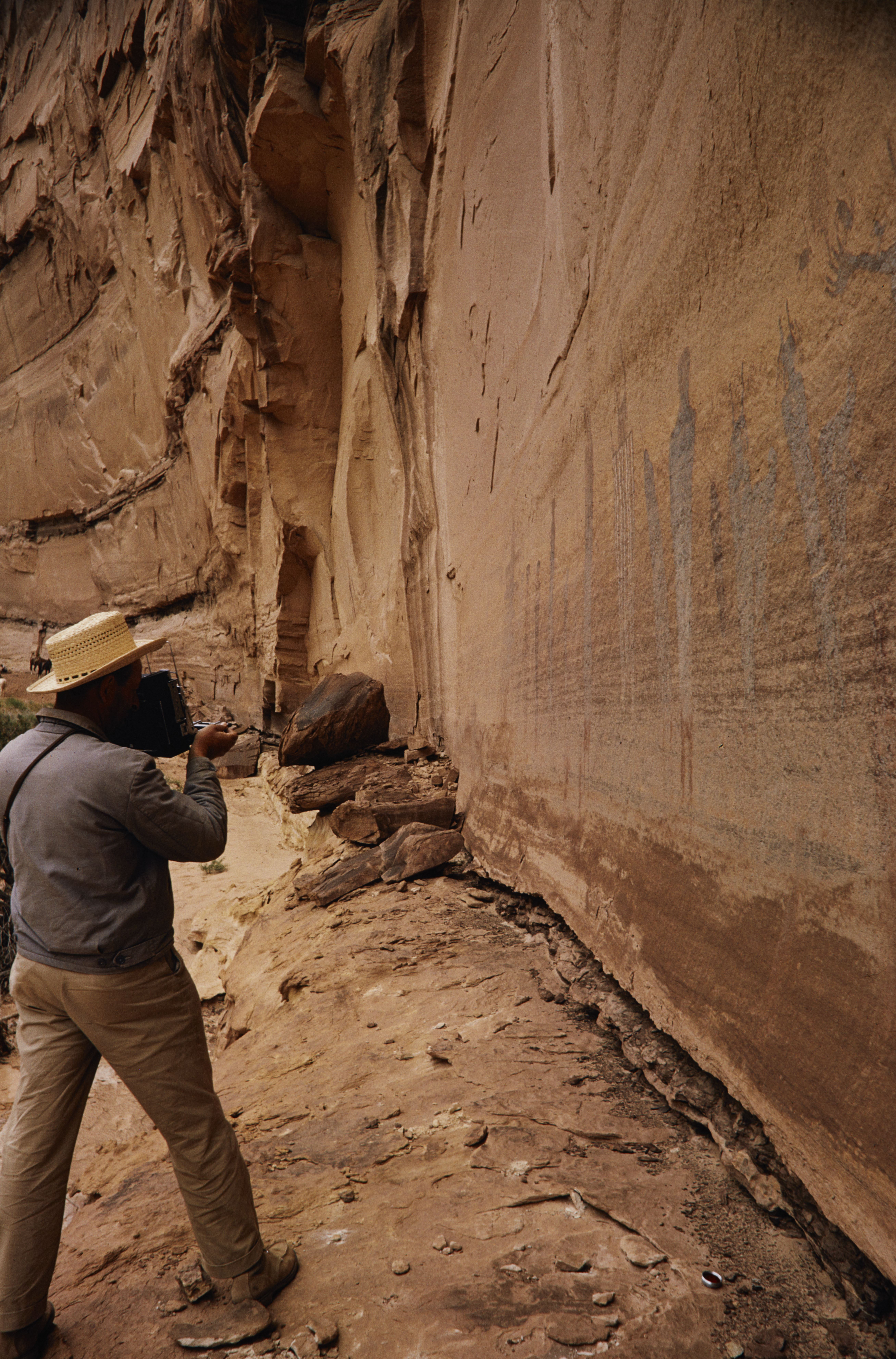 Man taking pictures of a petroglyph in Canyonlands National Park.