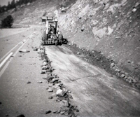 BW photos of rock slides in Kolob Canyons - 110mm. Bulldozer clearing rock slide. ; ZION Museum and Archives Image 107_06_21019 ; ZION 15933