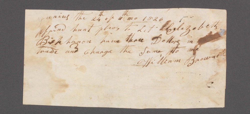 On front of document: "Junius the 24th of 11th mo 1826 friend hunt pleas to Let Elizebeth Bickhanon have three Dollars in trade and charge the Same to me William Brownell" On back of document: "Wm Brownell"