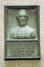 4' x 2' x 6' high, two-piece granite monument with 25" x 39" bronze relief portrait attached to front. Relief panel has inscription and decorative border.