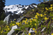 Yellow lilies grow on a slope with a snow-capped peak in the background.
