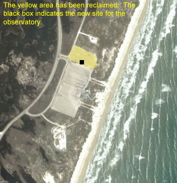 These photos show the recently built Malaquite Observatory. The observatory was built in response to a need to protect the telescopes used by amateur astronomers at star parties held at the park from the elements, which include wind, saline sprary from the nearby Gulf of Mexico, and the glare of headlights of visitors coming to attend the star parties. To combat these problems the park built this observatory, which has (1) a wall/fence made of closely-placed alternating slats to break up the wind (to minimize stress on the structure), but minimizing headlight glare (2) a concrete foundation to provide a steady support for the telescopes (3) benches placed around the inside perimiter for the comfort of people waiting to peer through the telescopes. Minor modifications will soon be made to allow some slats to be removed to allow telescopes to view objects lower than the top of the wall and a white section of the inner wall to act as a screen for slide shows. This facility will also be used during daylight hours as a teaching area for environmental education programs.