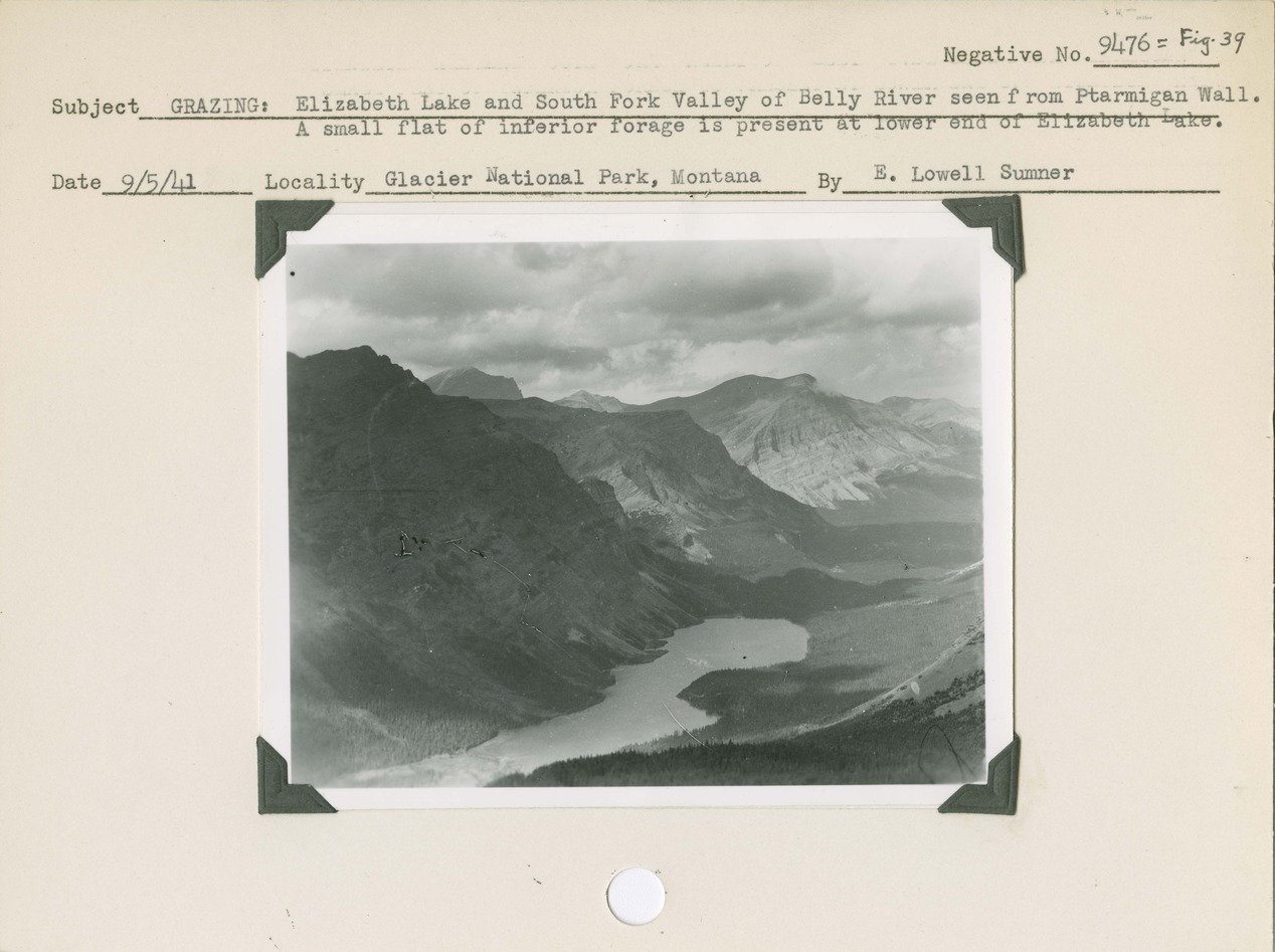 Grazing: Elizabeth Lake and South Fork Valley of Belly River seen from Ptarmigan Wall. A small flat of inferior forage is present at lower end of Elizabeth Lake. Locality: Glacier National Park, Montana. Negative #: 9476