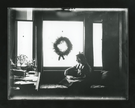 A girl reads a book near a window decorated with a wreath. Possibly Erica Thorp de Berry. The window is in the study or parlor at the front of the Thorp house at 115 Brattle Street. Notes: Similar to January 1903 images. "Christmas" on box label.
