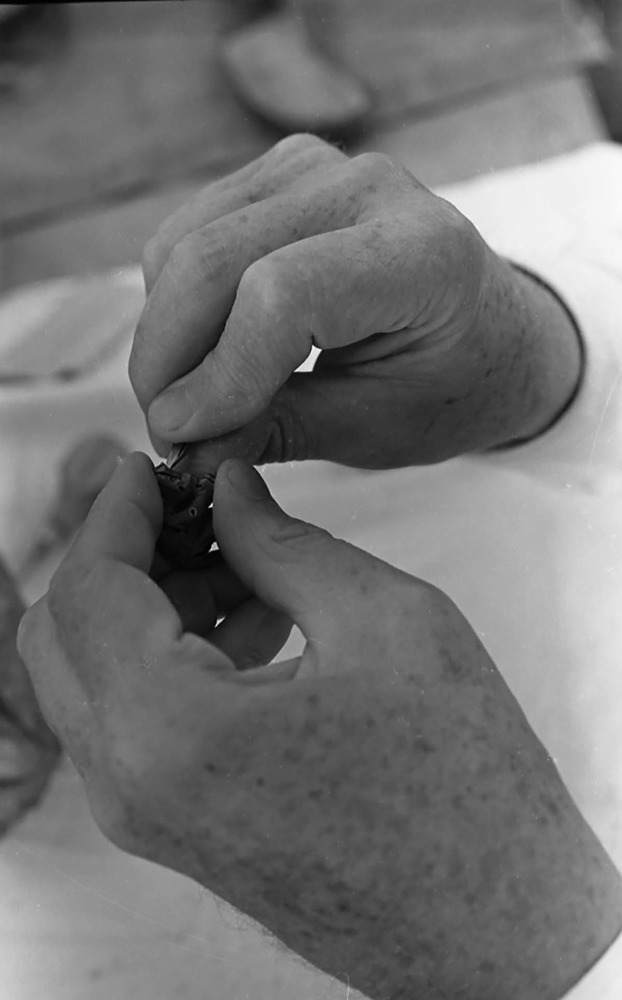 Lamond Tait braids horsehair into belts, hat bands, and whips at third Folklife Festival at the Zion National Park Nature Center, September 1979. ; ZION Museum and Archives Image ZION 13785 ; ZION 13785