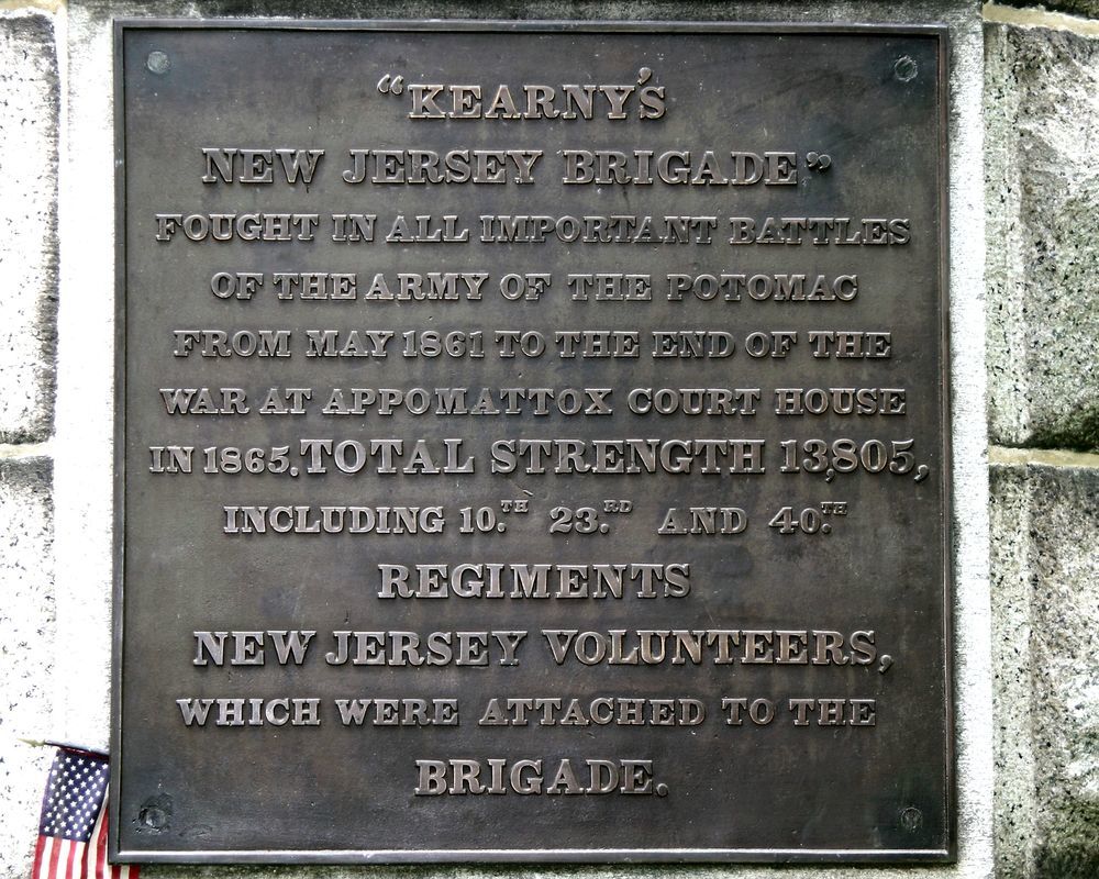 1 of 12 Mn to NJ. Only Mn to honor 1st, 2nd, 3rd, 4th, & 15th NJ regiments. Indicates general position held by Brigade Jul 2-3, 1863. Flank Markers denote specific line positions. Vista opened to Mn 1902. Located E side of N Sedgwick Av. || Mn w/ 4 flank markers. Base 7'dia. Coursed, rough-cut shaft w/ decorative banding on turret design. Excised lettering base, minature temple surrounds front bronze tablet. Bronze tablet, back, bas-reliefs sides. All 12'H. Mkrs eroded, 1'sq x 1'5".