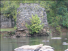 Pillar in river near boat ramp with overgrowth; picture taken to shore showing another pillar behind