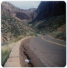 Two-way road divided by yellow dotted lines with Zion landscape in background. ; ZION Museum and Archives Image 002.12.02-24of31 ; ZION 15933