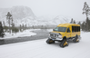 Yellow snowcoach driving on snow packed road alongside the Madison River