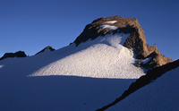 Sunset on Mt. Lyell from East lobe of Lyell Glacier. Summit Mt. Lyell to left of large rock mass. Yosemite Original. A2412. A-30-i-3. John Krisko. Public Domain. A-24-22-007.