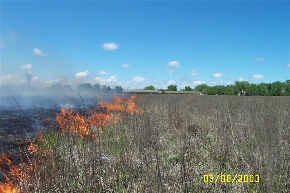 Depicts a prescribed grasslands burn at Fort Larned National Historic Site, May 2003.
