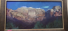 A painting depicting moonlit sandstone cliffs near the Sentinel summit in Zion Canyon. The cliffs are topped with white snow, which glows in the moonlight. Below, the pale sandstone turns to earthy oranges and browns, before fading into the shadows of the canyon.