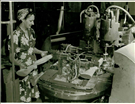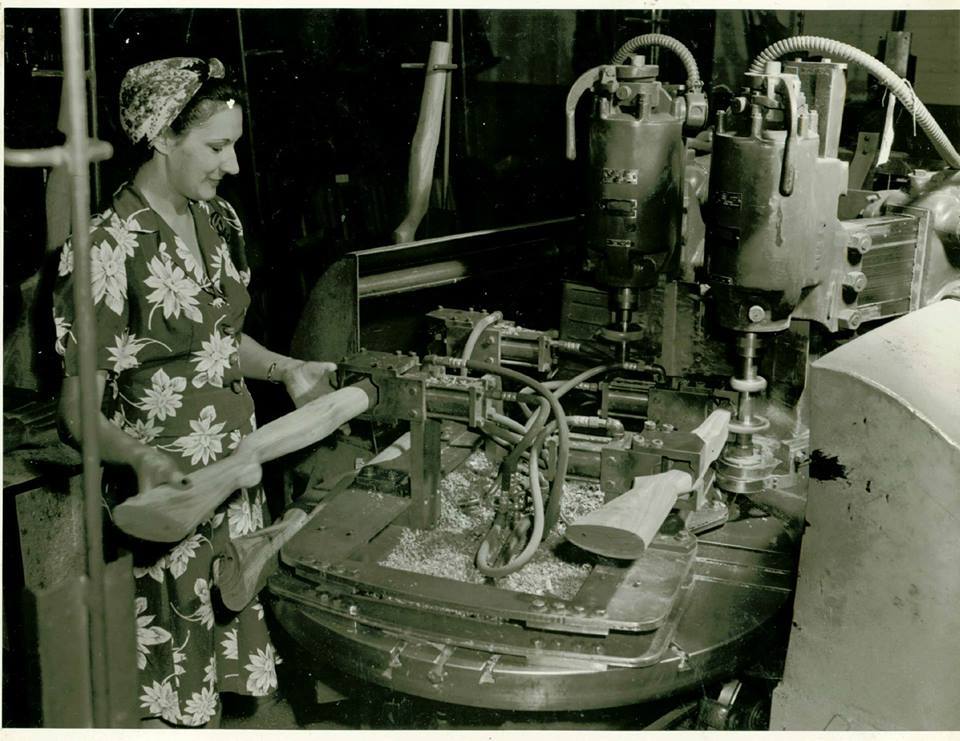 Mechanization increased rifle production during WWII. Pictured: Cathcart is loading a gun stock into a machine which will automatically shape the gun stock. The person at this station became known as a 'stocking stuffer'.
