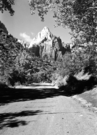 The Twin Brothers and Mountain of the Sun (east wall of Zion Canyon) with Zion Canyon road on right side. ; ZION Museum and Archives Image 13368 ; ZION 13368
